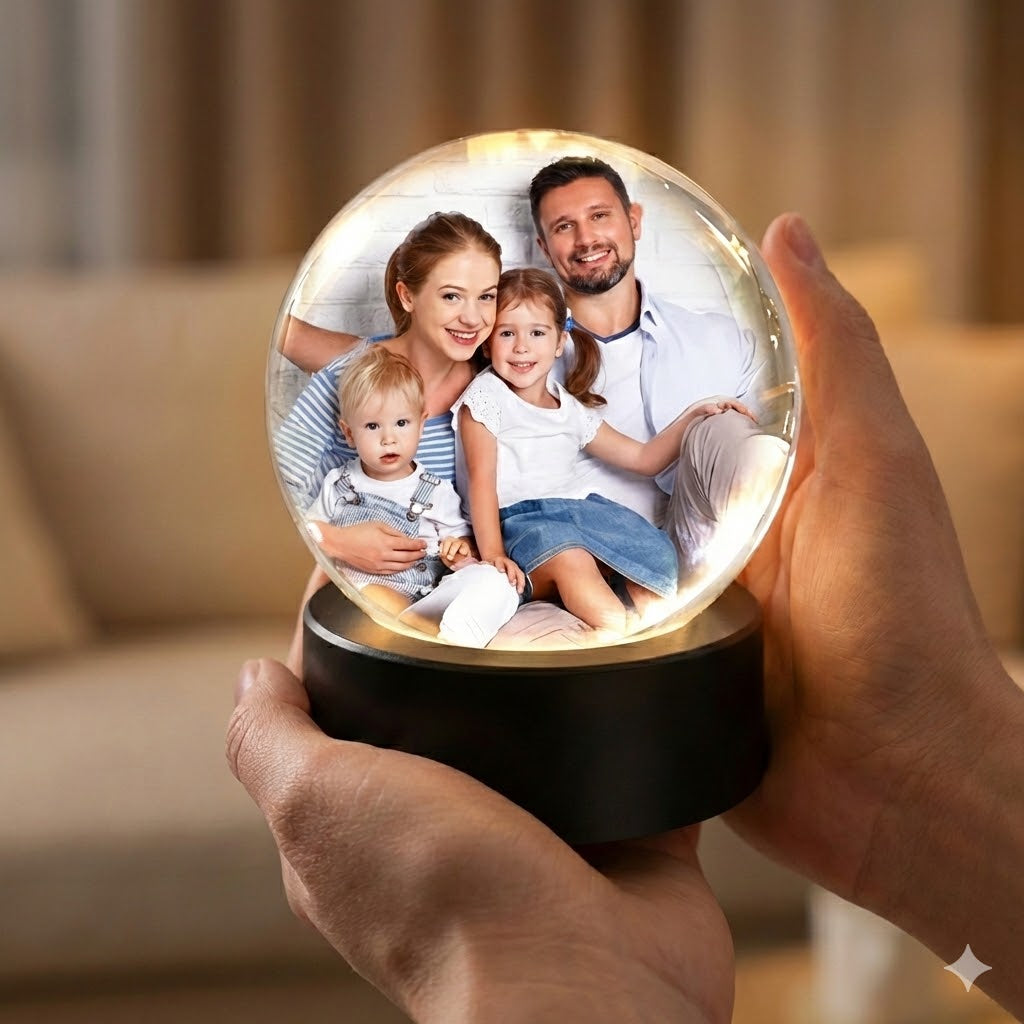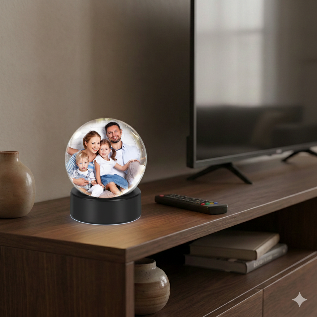 Kada se video prikaže unutar ove kugle, stvara se prelepa 3D iluzija — kao da je vreme stalo u trenutku koji najviše voliš. Bilo da su to prvi koraci deteta, snimci sa venčanja ili nezaboravna putovanja, sada ih možeš gledati u kristalnoj formi svakog dana.